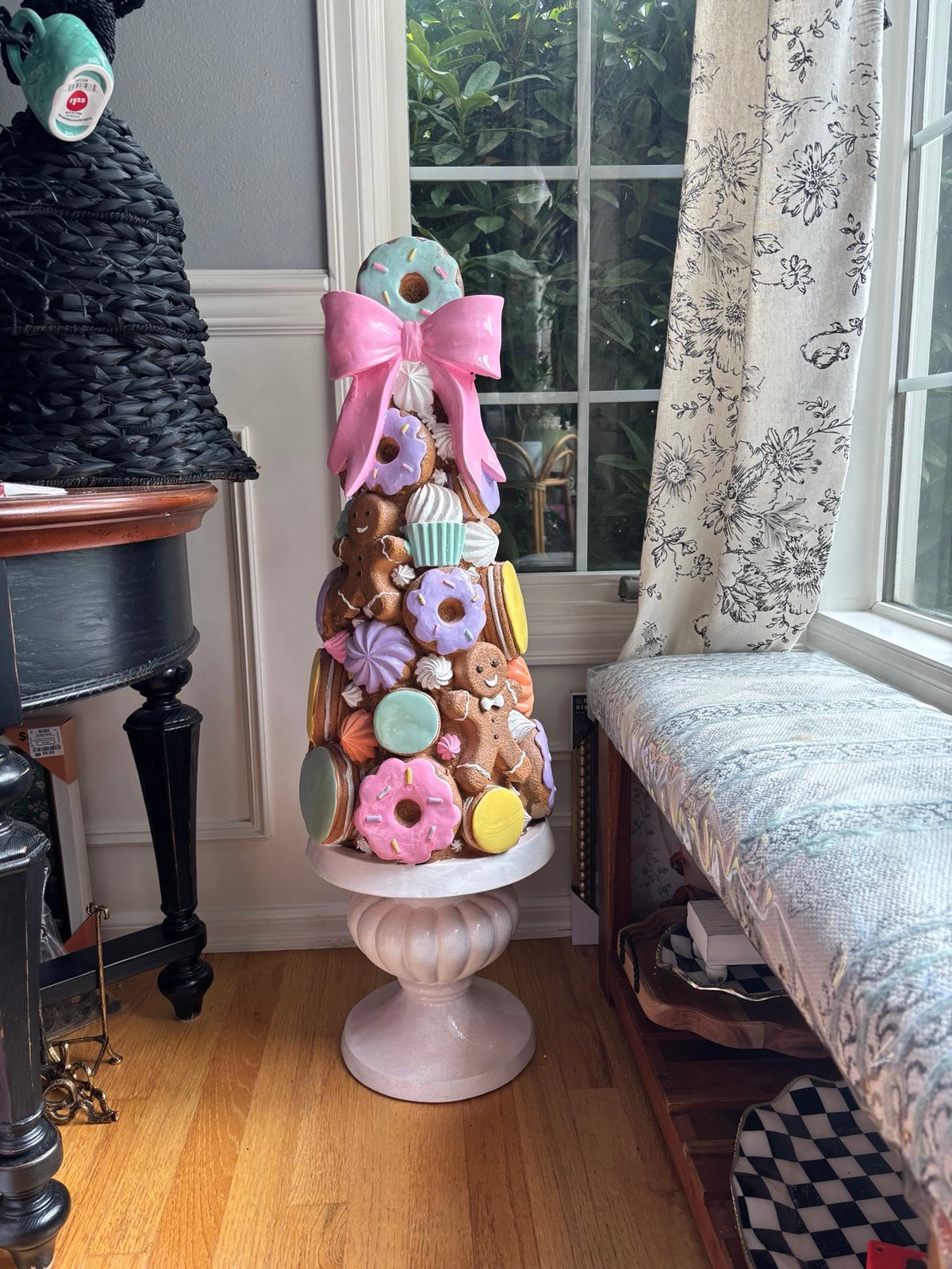 Giant at around 3ft tall - outdoor safe donut, macarons & all the yummy things gingerbread topiary tree topped off with a pretty pink bow, of course.
